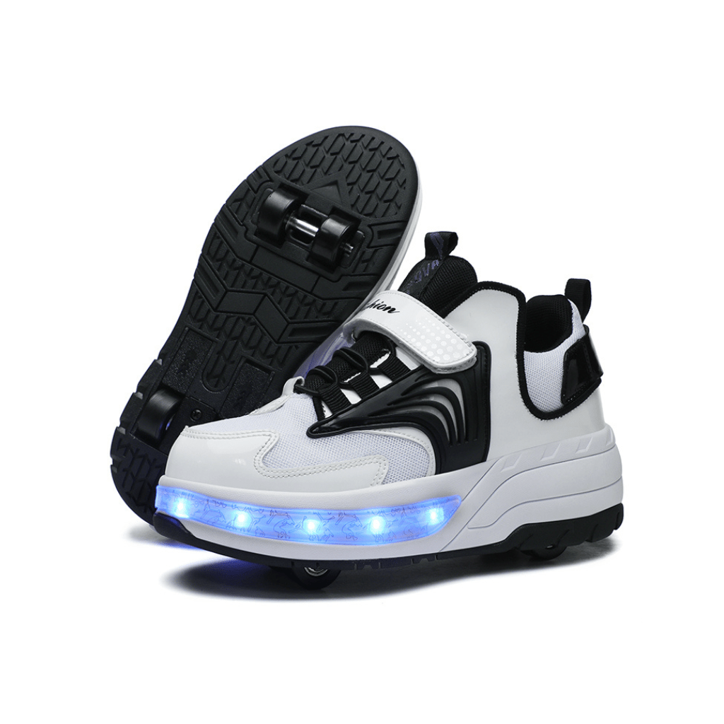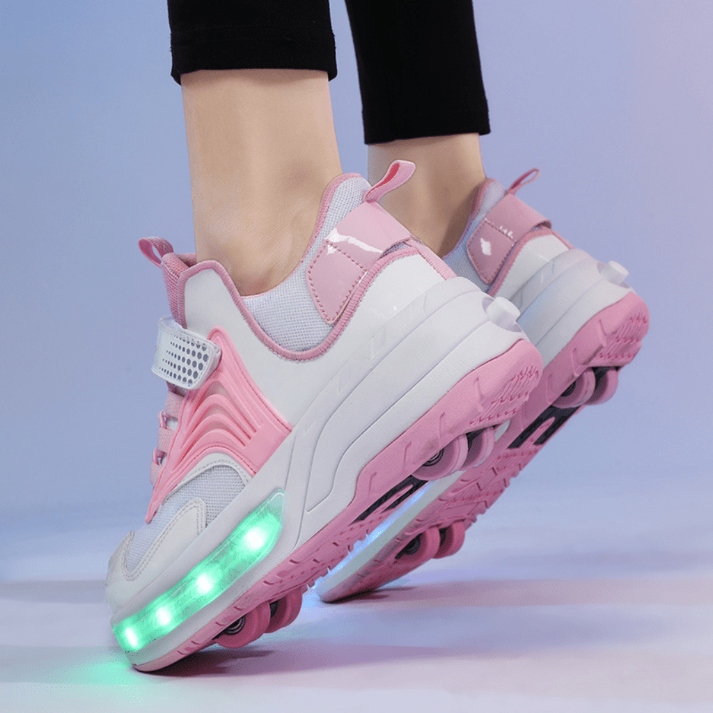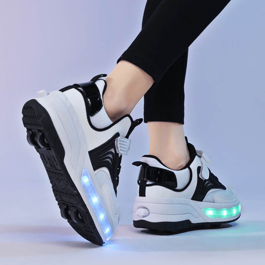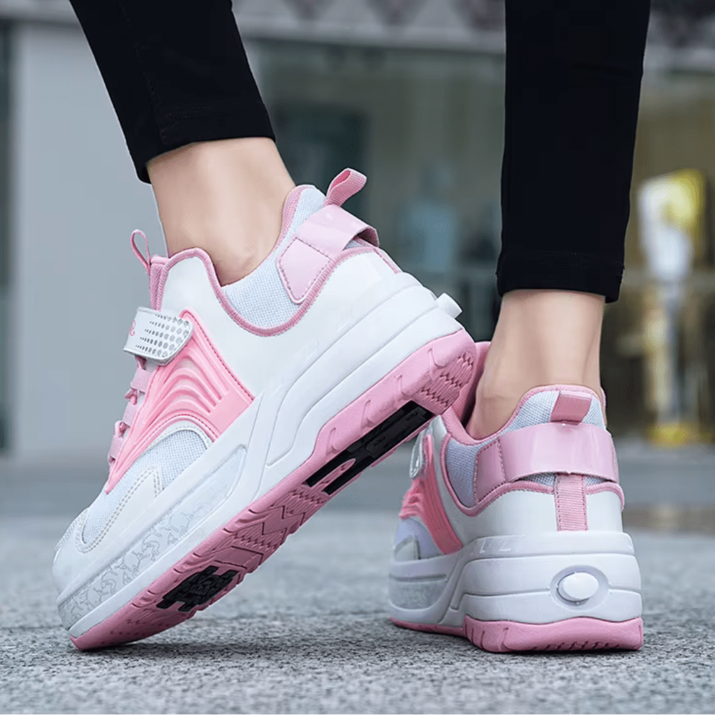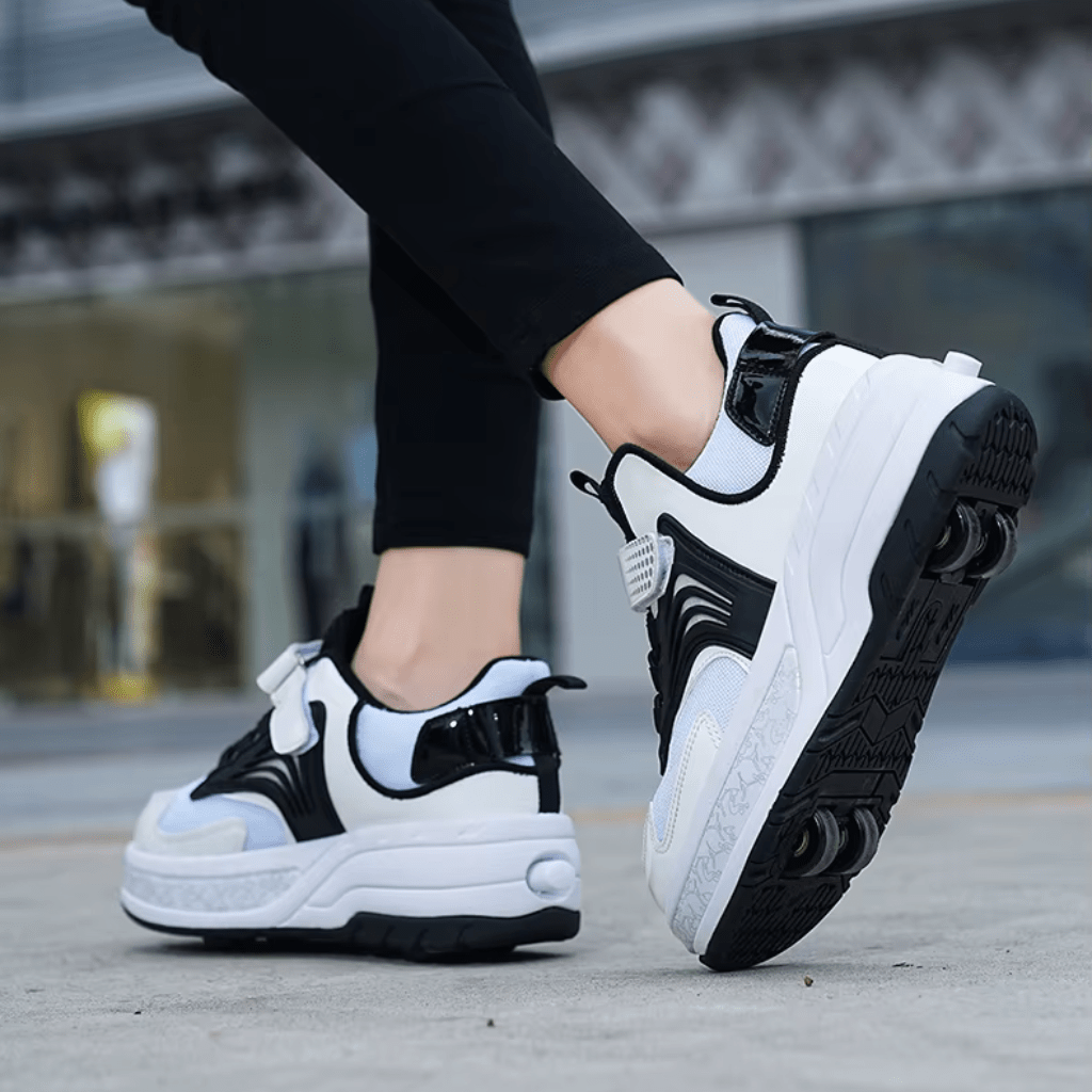 Our Heel Wheel Roller Shoes are designed with a smart dual-wheel system that makes switching between walking and skating easy. The rear pop-up wheels fold neatly into the heel when not in use, giving you a stable sneaker for everyday walking. To activate, simply press the discreet button on the heel and the wheels pop out, ready for smooth rolling.